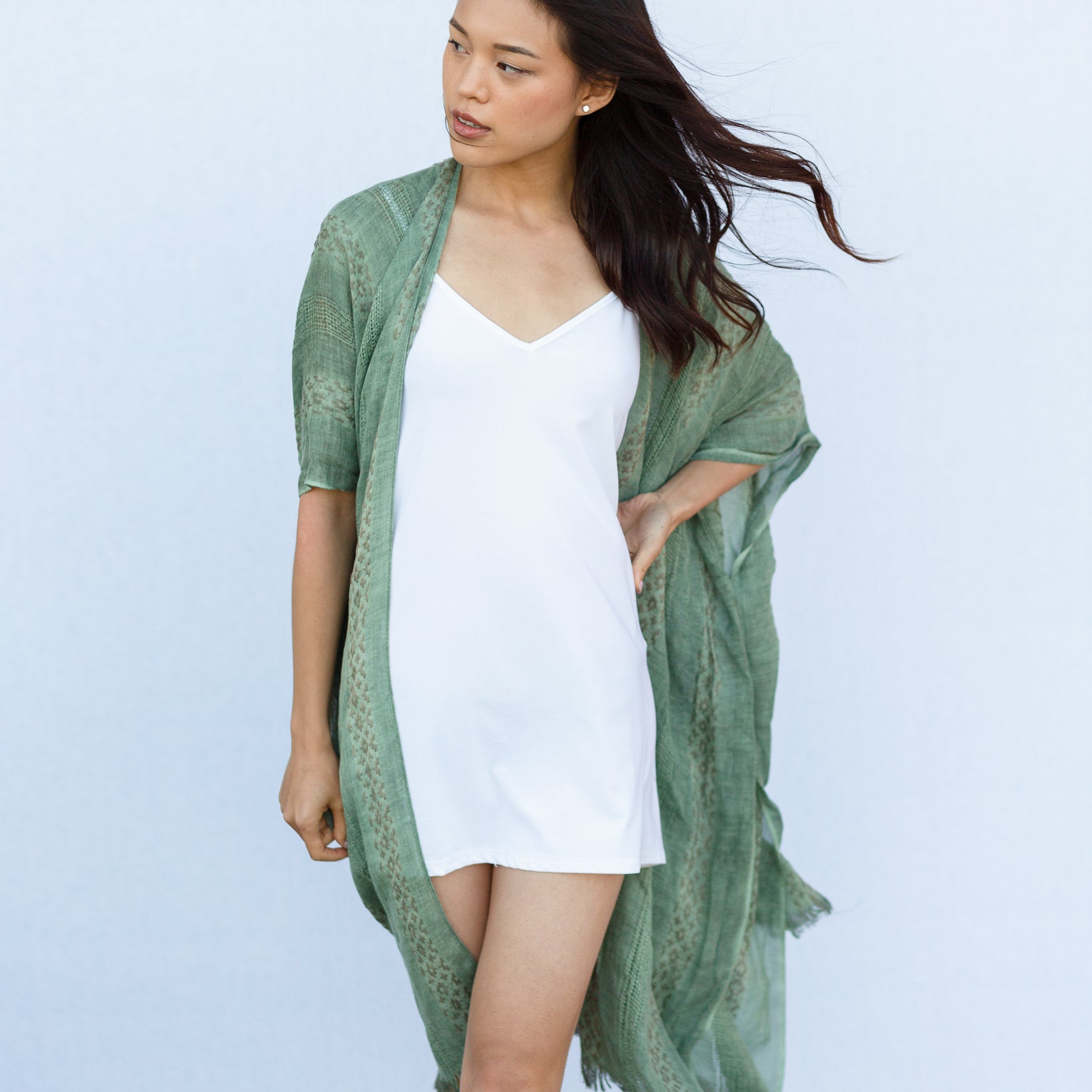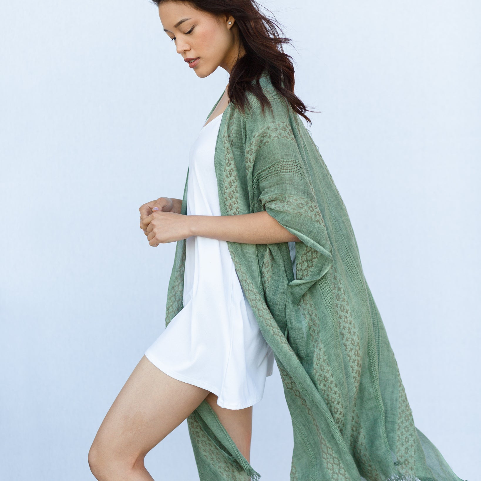 This lightweight long kimono beach cover up style adds the perfect pop of colour to a dress or pair with jeans for a laidback look. Layer the Anna with a long sleeve tee or dress, and head out the door! The Anna kimono beach style creates effortless style for loungewear around the house. Perfect kimono cover up for fashionable maternity clothing!