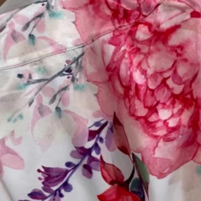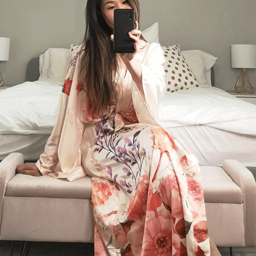 Aphrodite Long Pink and Floral Print Robe with Kimono Sleeves