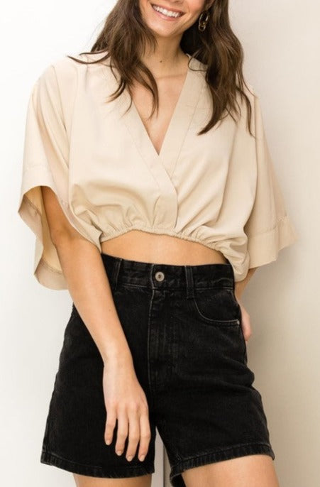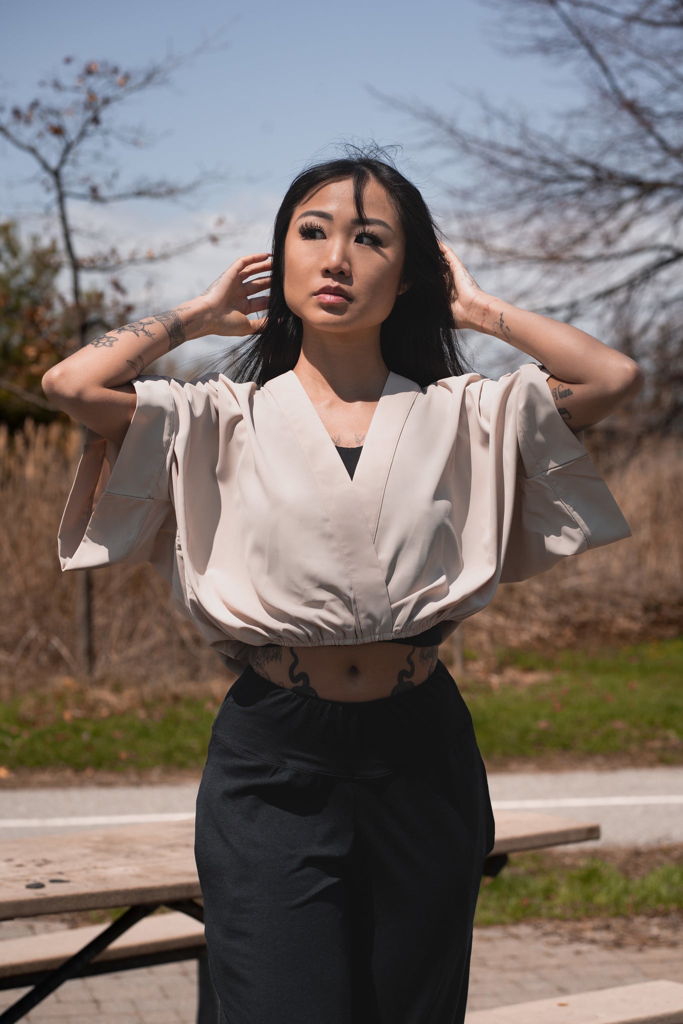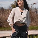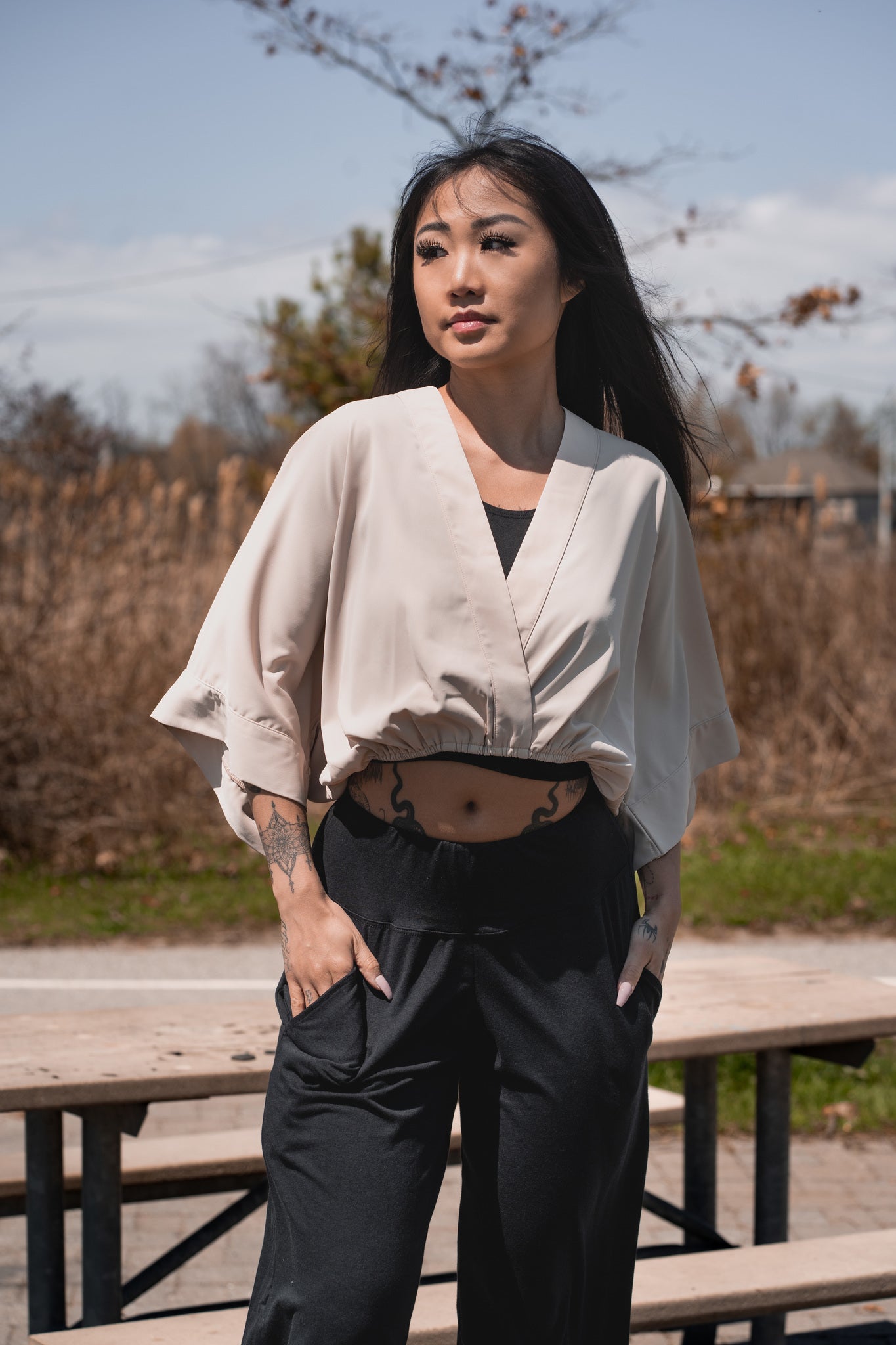 This Women's Kimono Crop Top in Beige is the perfect combination of style and comfort. Its easy-fit design pairs perfectly with our bamboo cropped pant . Its elegant kimono sleeve design offers an effortless look to suit any occasion.