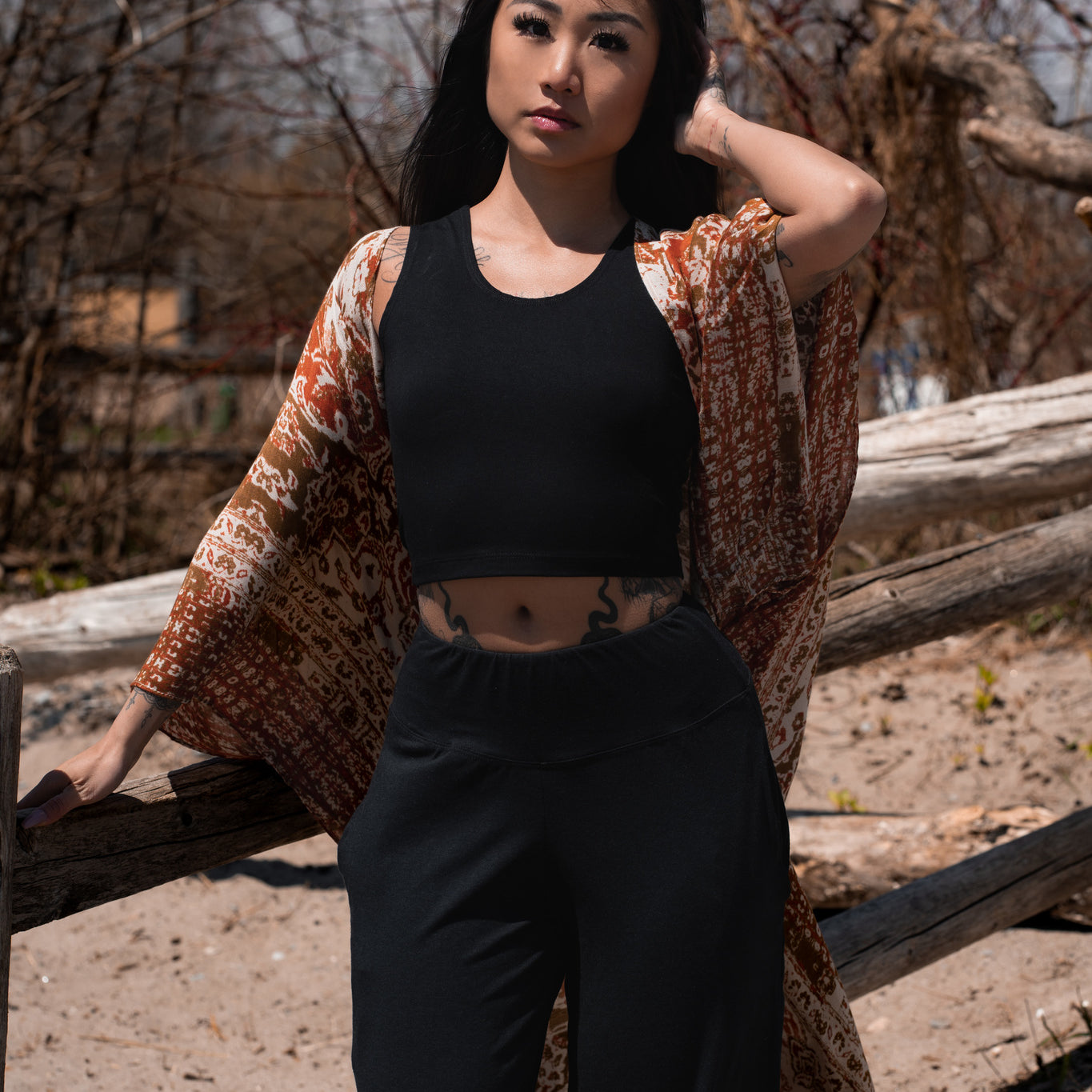 Model is wearing one size and paired it with our black bamboo crop top and black bamboo wide leg lounge pants.